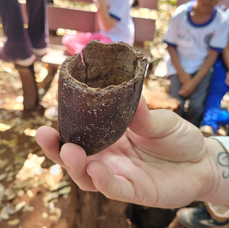 Na trilha de volta, ouvimos som de passarinhos e macacos e vimos uma árvore de 250 anos, o jatobá. Encostamos a mão na árvore, tiramos fotos e continuamos andando. Quando chegamos, vimos “estátuas” de bicho, lanchamos e voltamos para a escola. Fim.